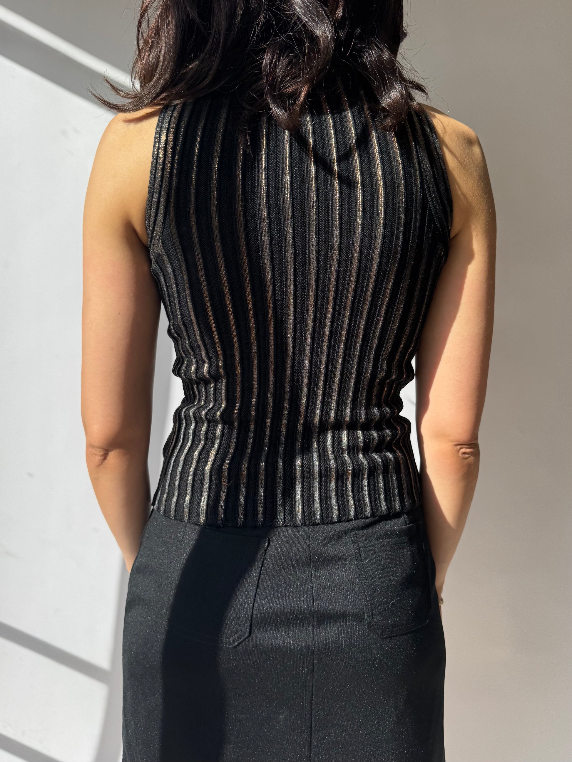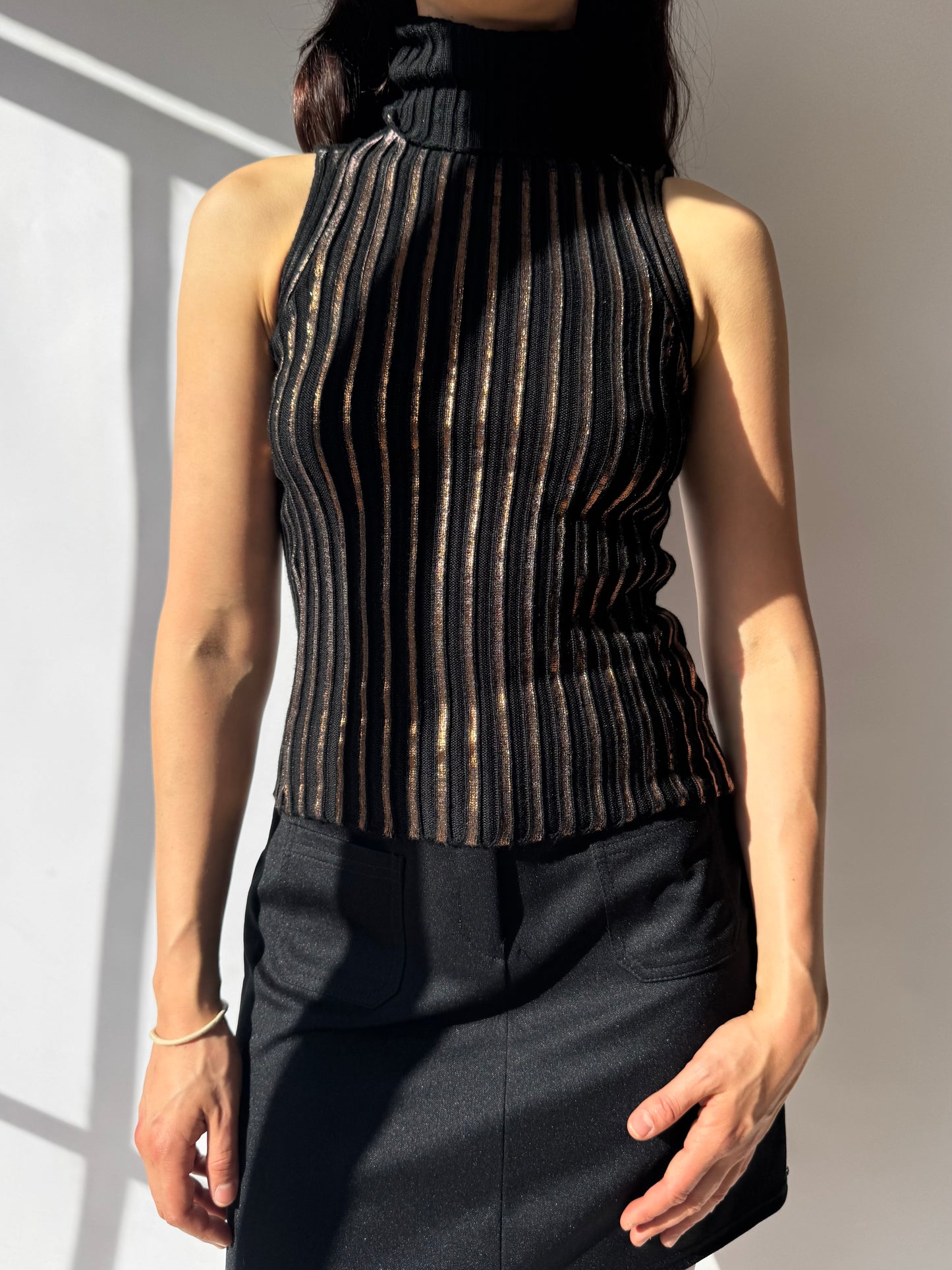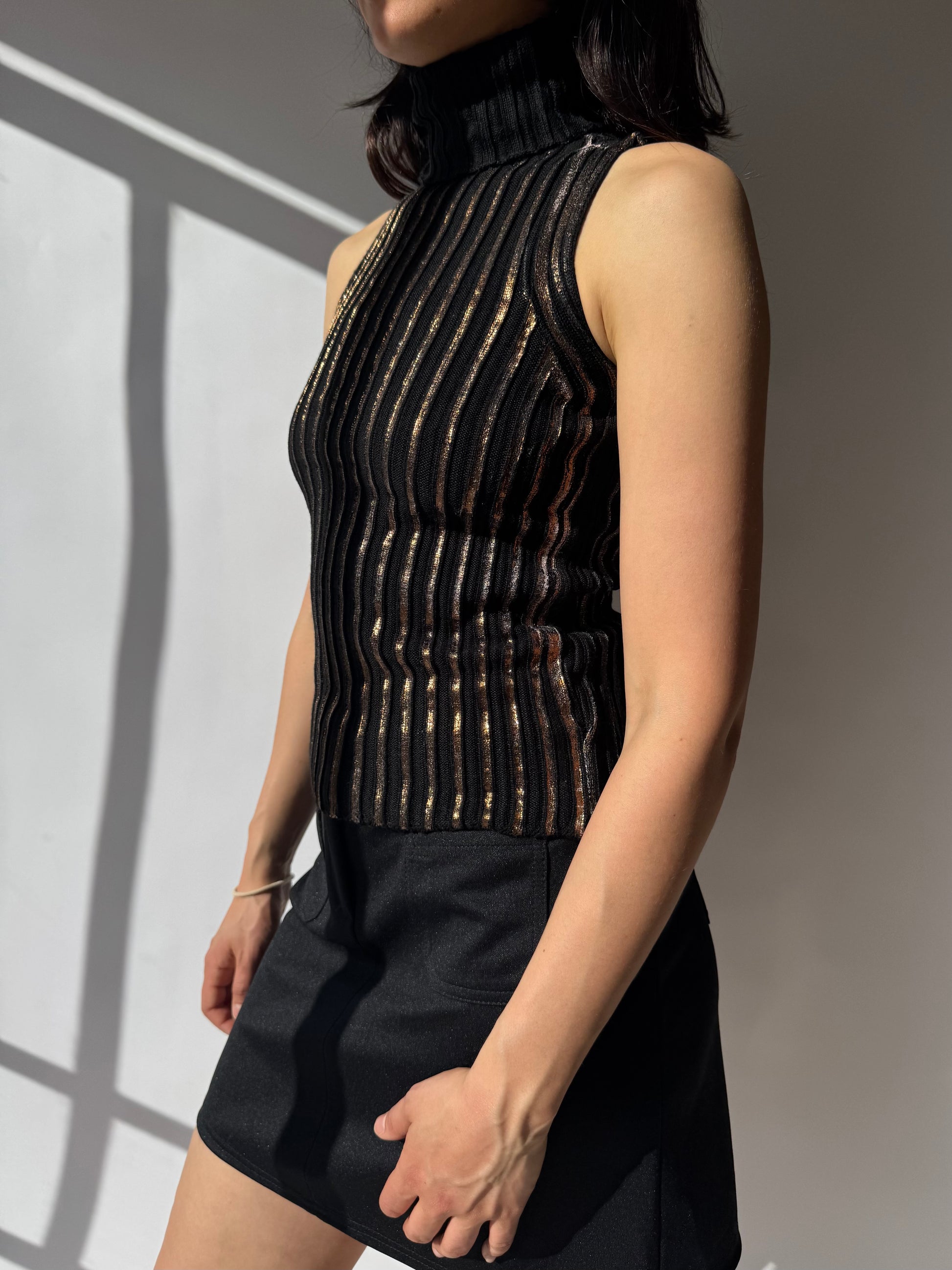 גופיית צווארון גבוהה שחורה בגזרת סריג. בד שקוף בפסים אנכיים מנצנצים בגווני זהב ונחושת.