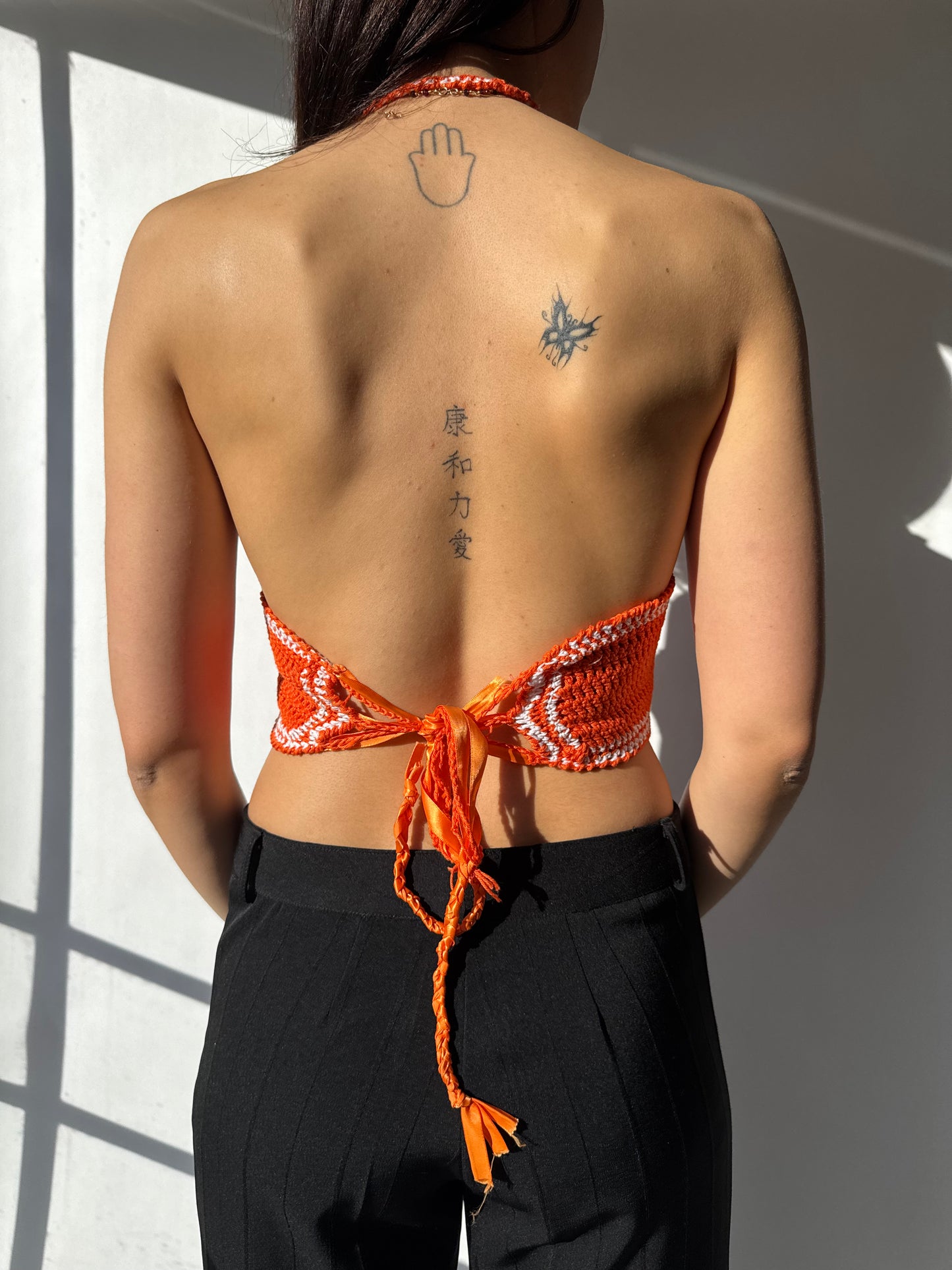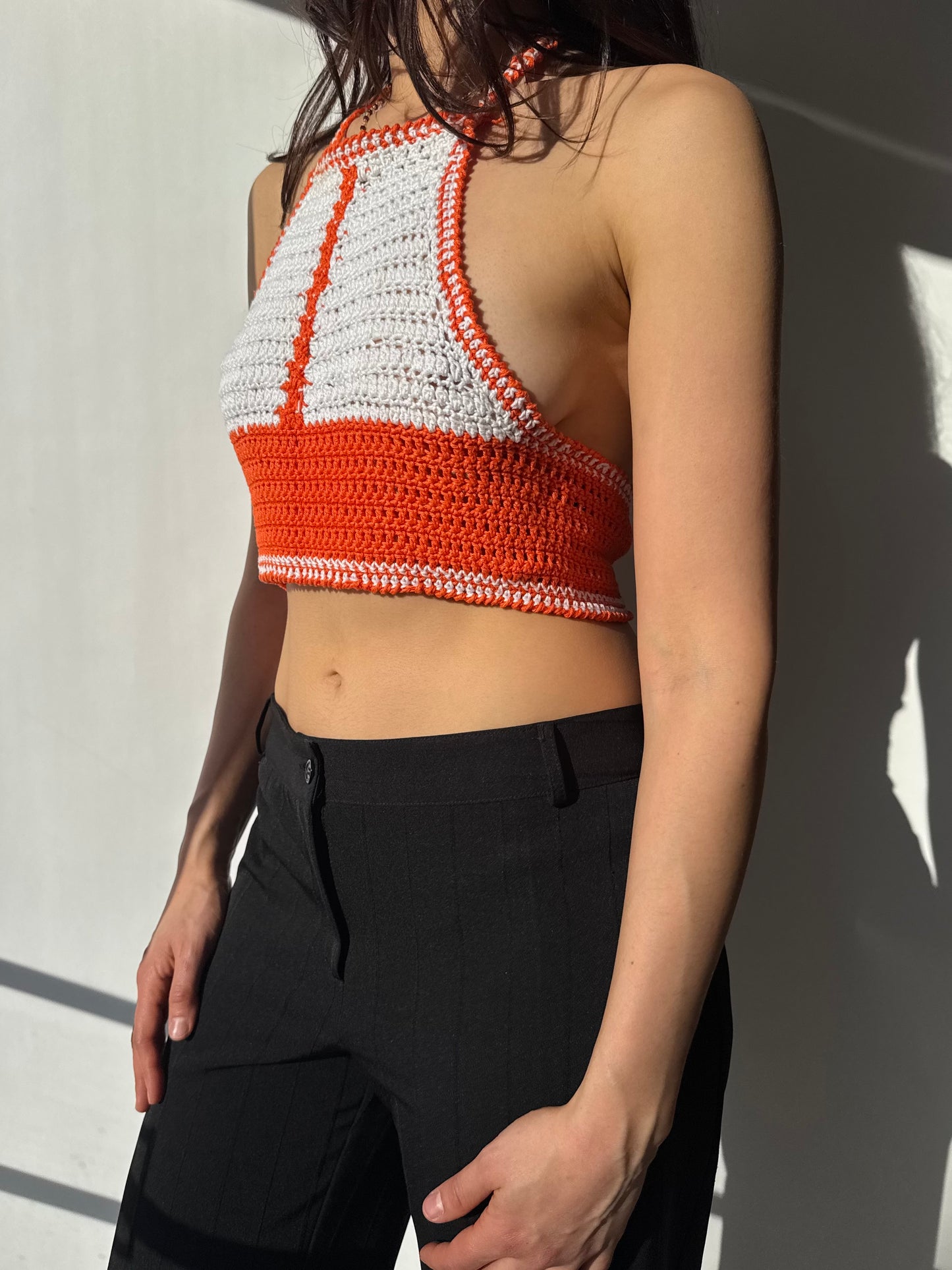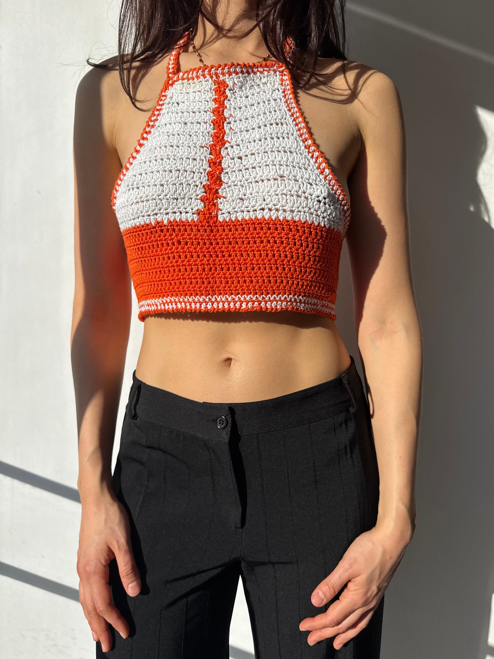 גופיית קרושה בגזרת קולר בצבעי כתום ולבן.סגירת קשירה מאחור.