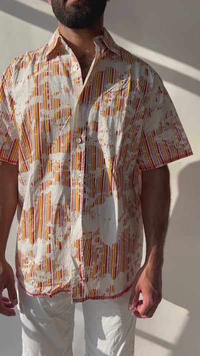 חולצה מכופתרת בהדפס פסים בגווני אדום וצהוב. כיס בחזה.