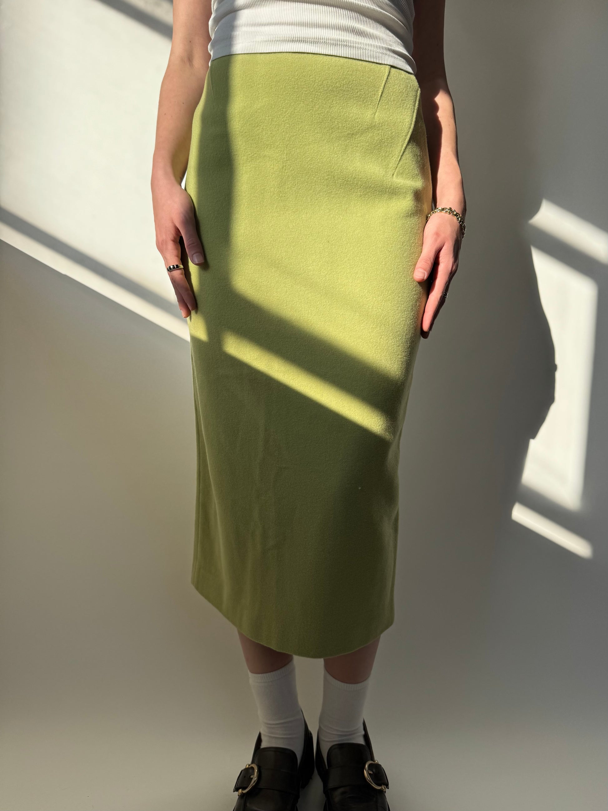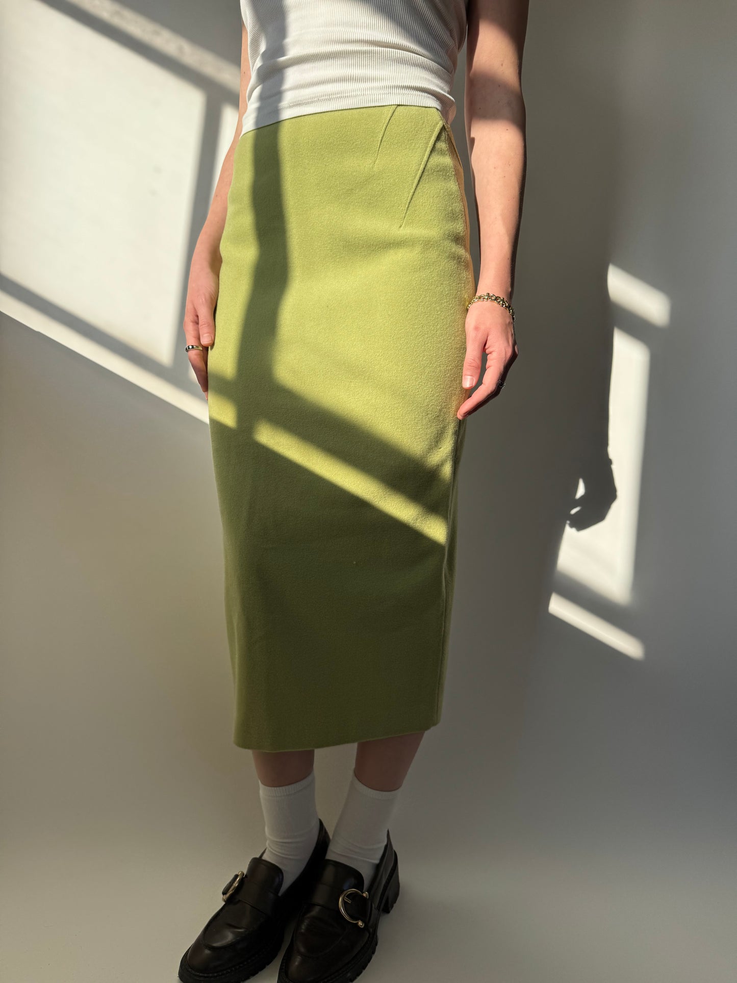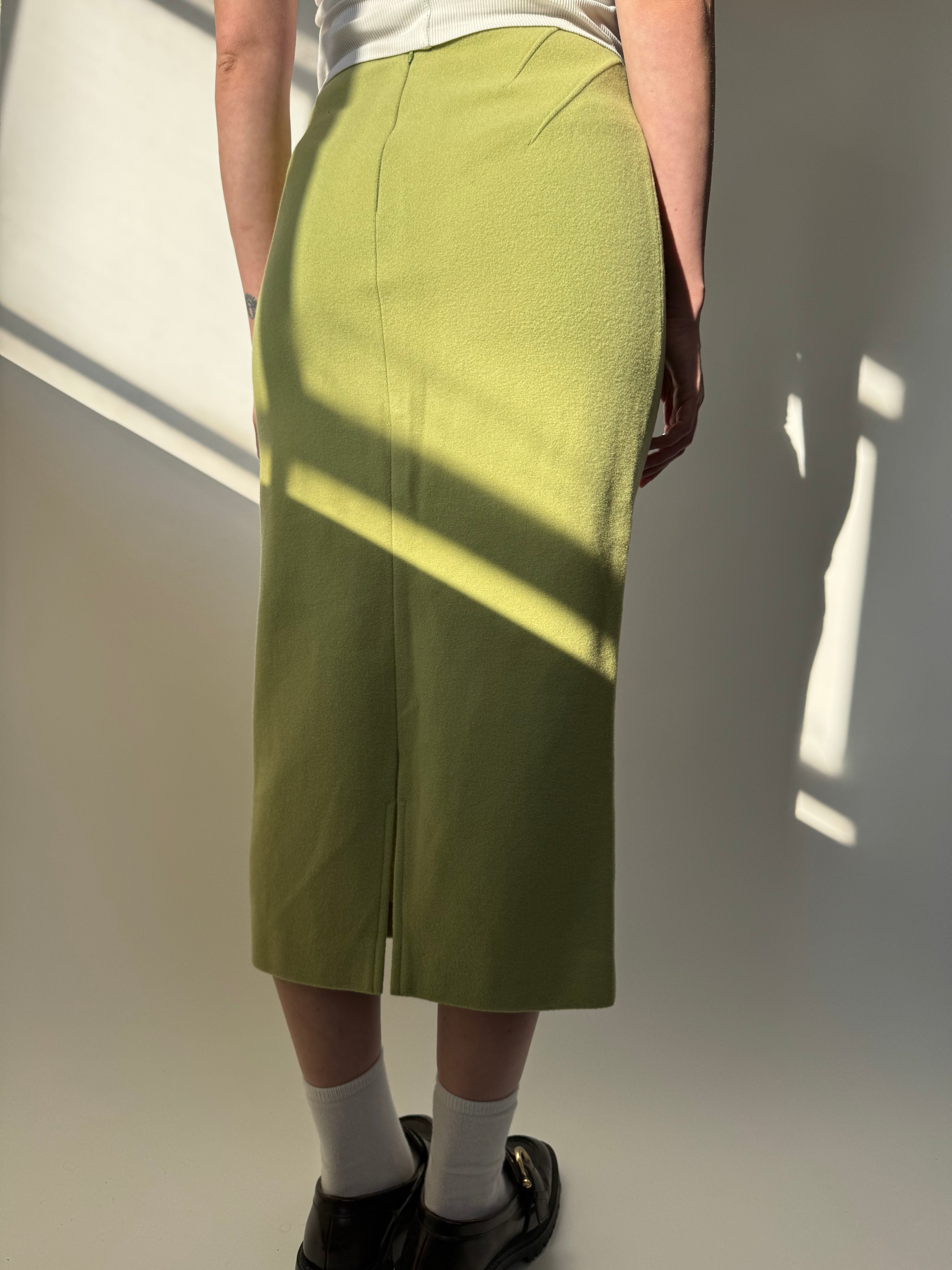 חצאית מידי בגזרה גבוהה וצמודה בצבע ירוק ומבד צמרירי. סגירת רוכסן ושסע מאחור.