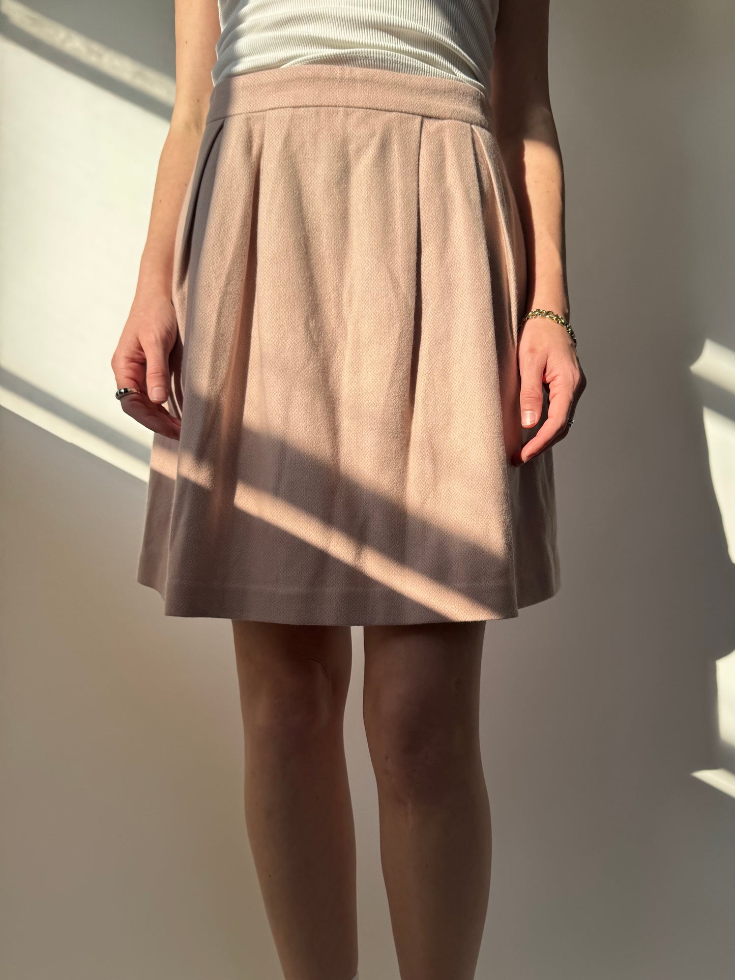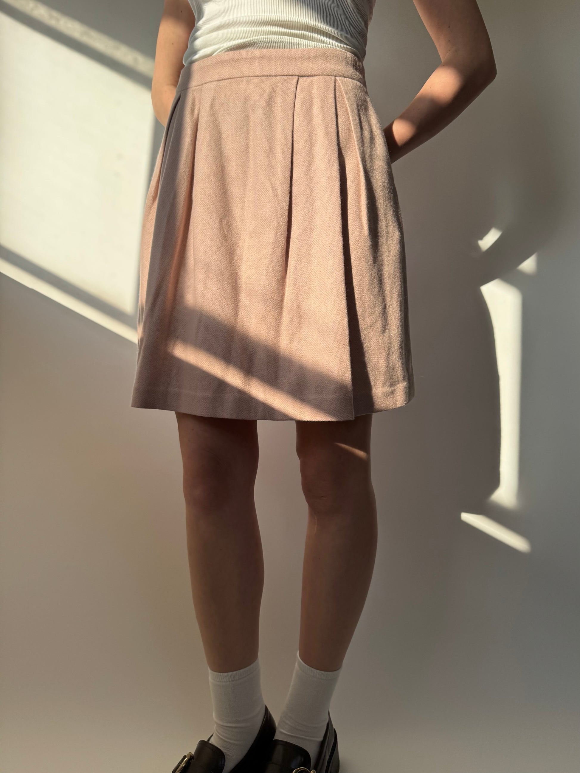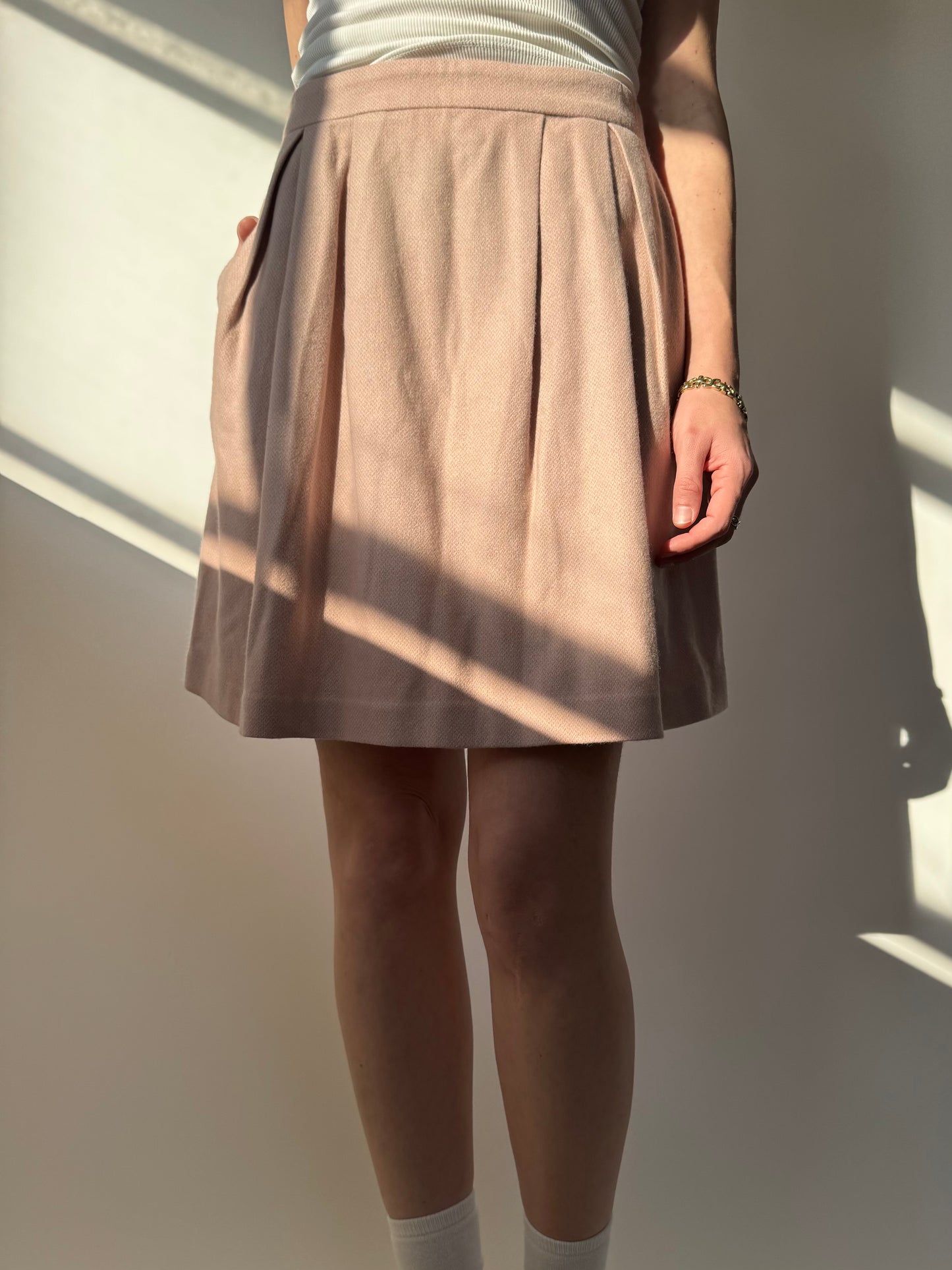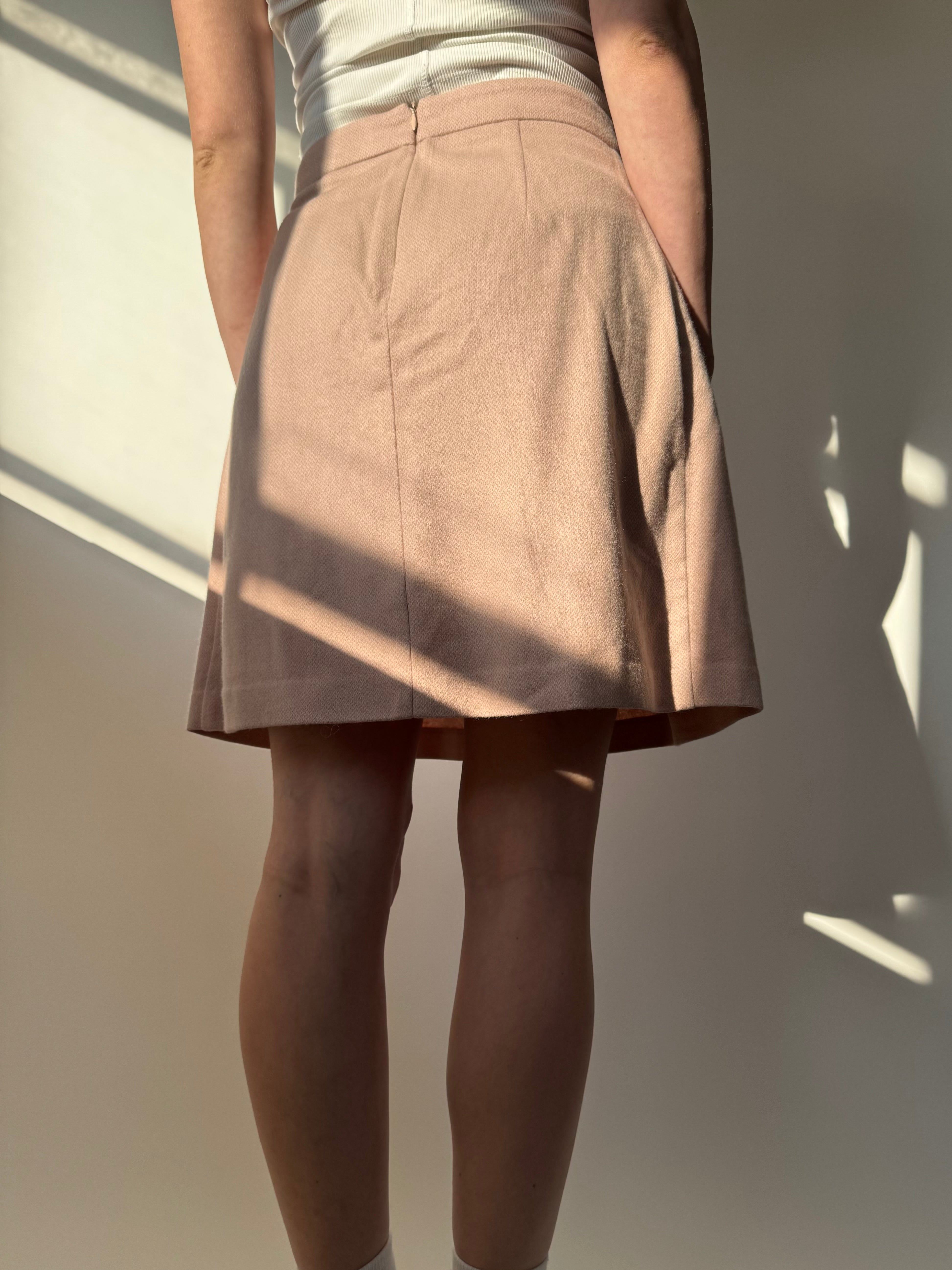 חצאית מיני ורודה מצמר עם קפלים. שני כיסים בחזית וסגירת רוכסן וקרס מאחור.