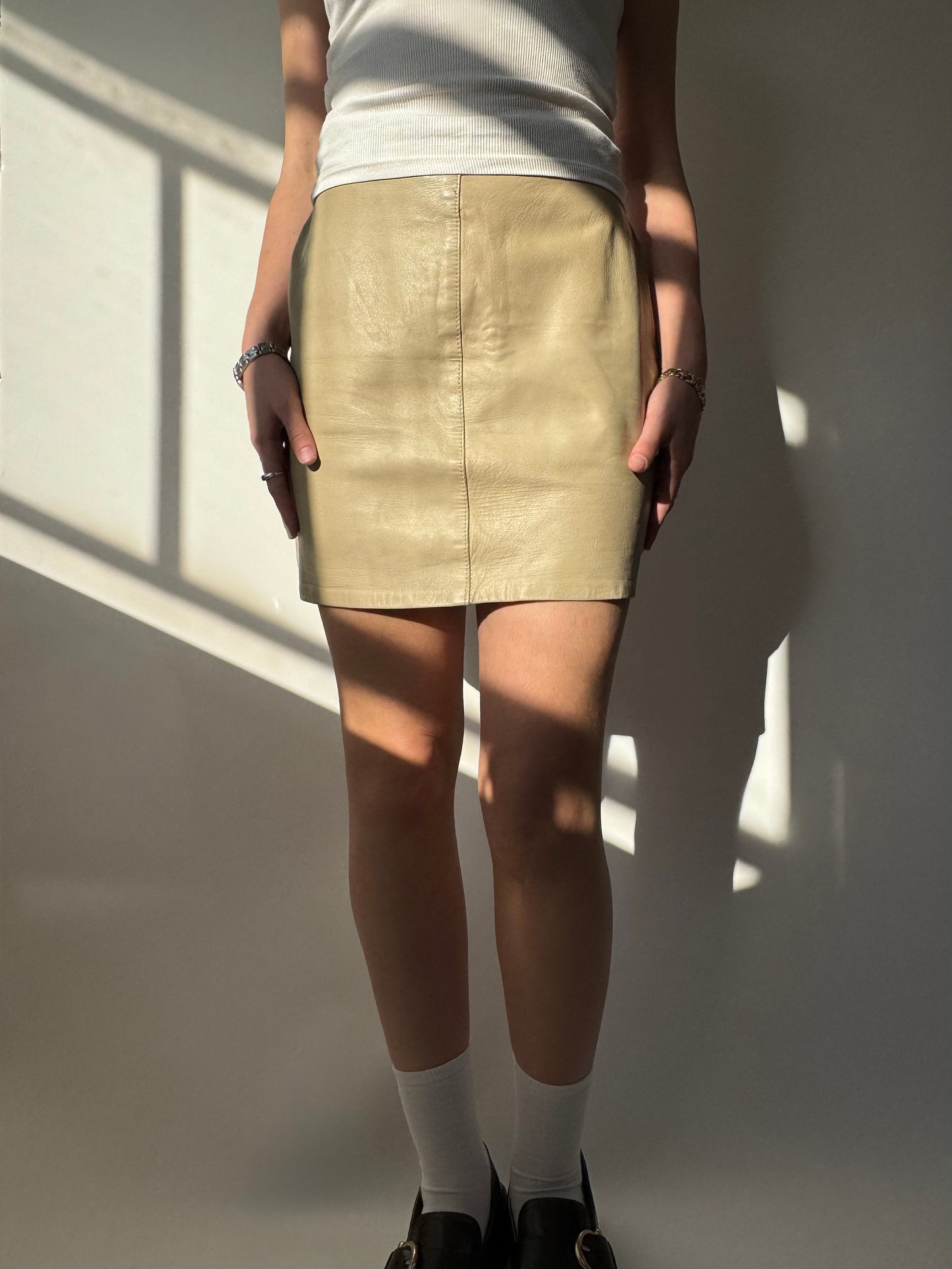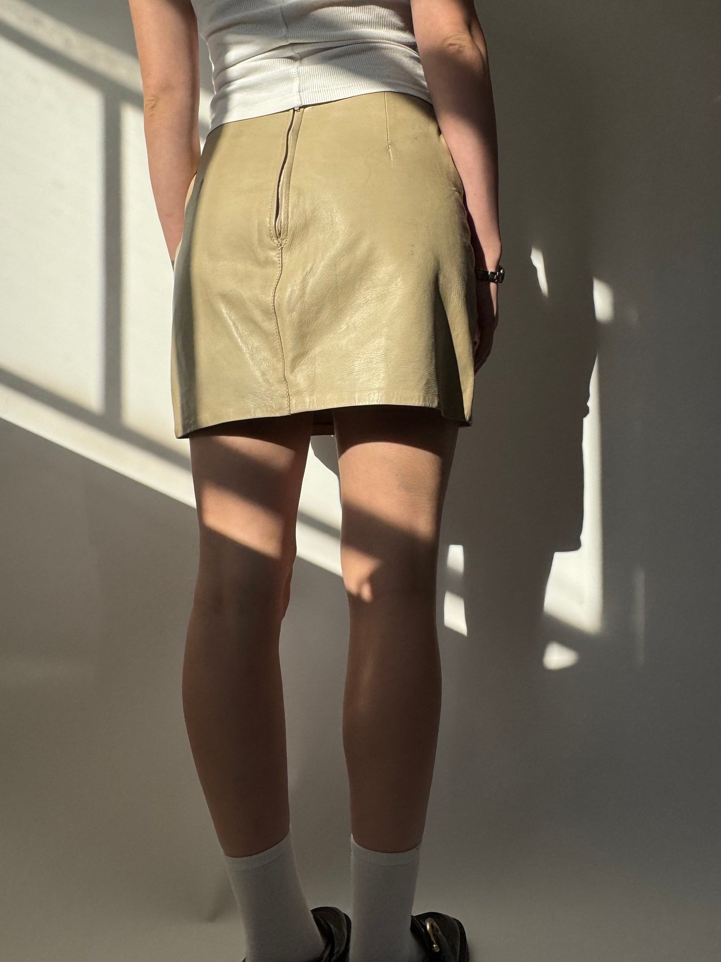 חצאית מיני מעור בגווו בז׳, סגירת רוכסן וכפתור מאחור.