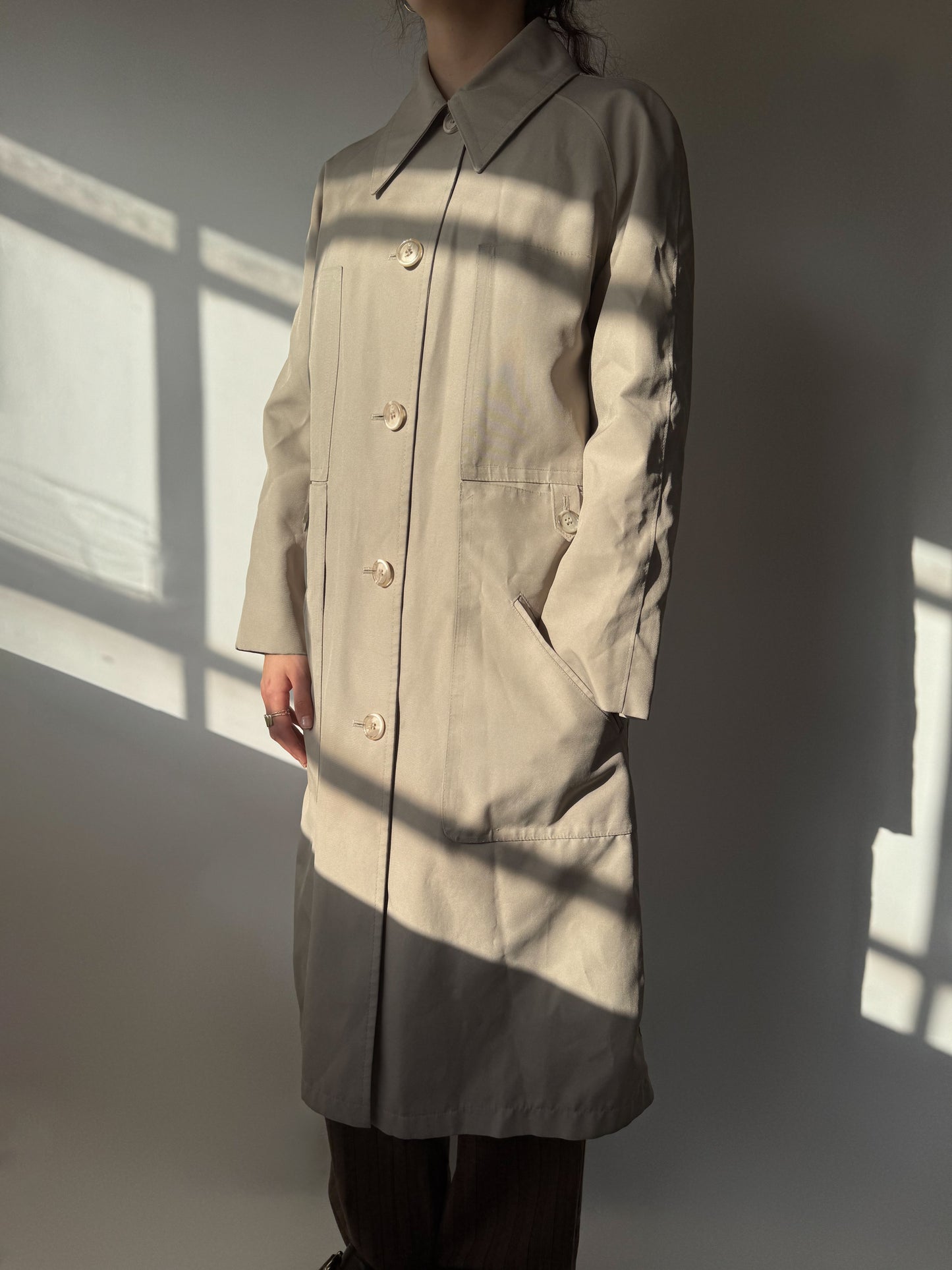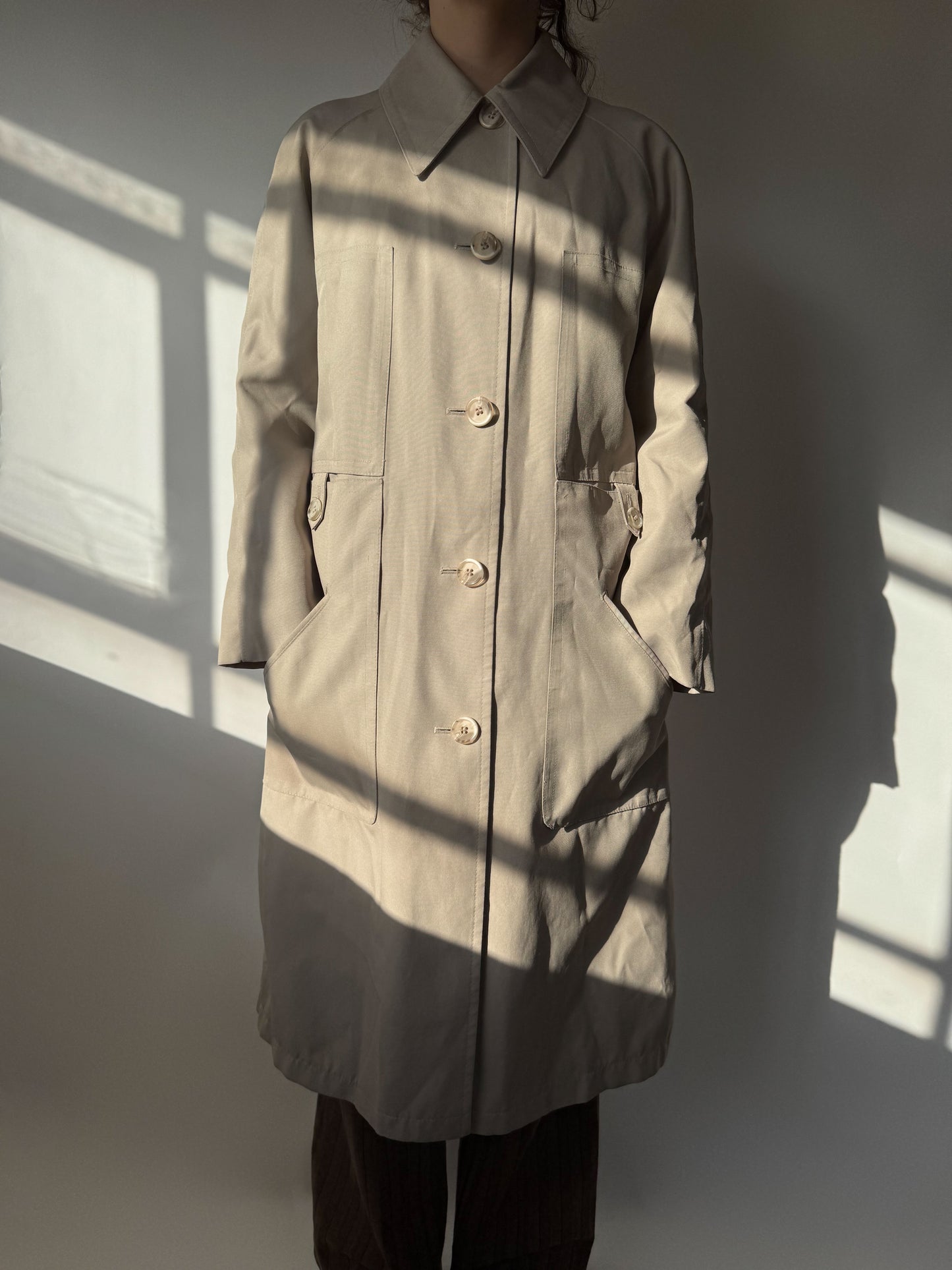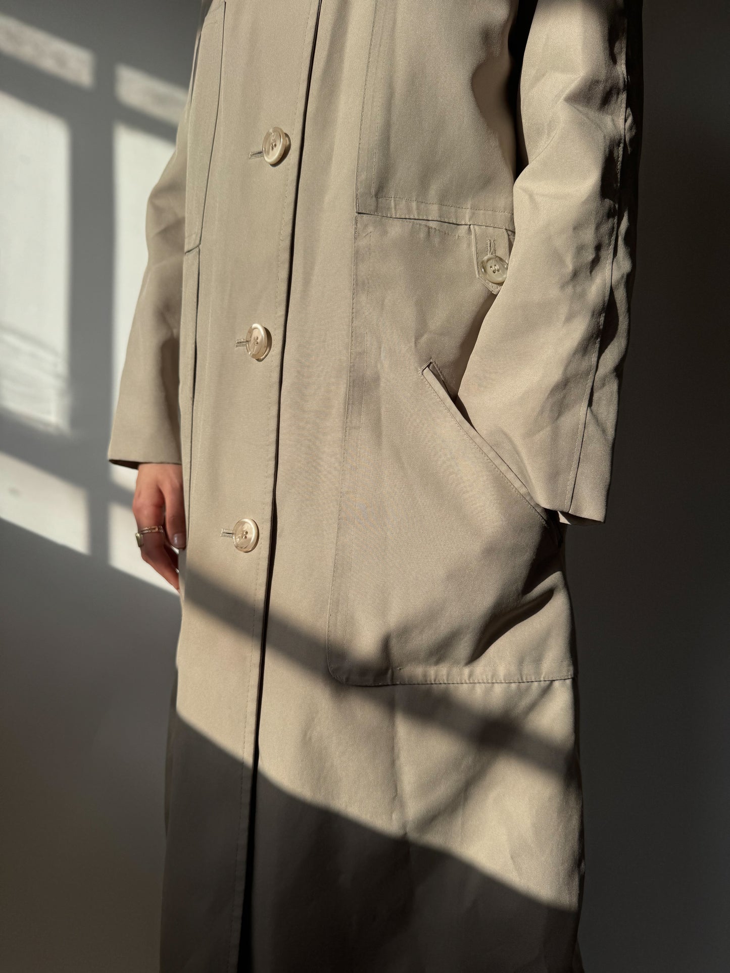 מעיל טרנץ׳ בצבע בז׳, גזרת A. ארבעה כיסים בחזית וסגירת כפתורים לכל האורך. בטנת צמר אדומה הניתנת להסרה.