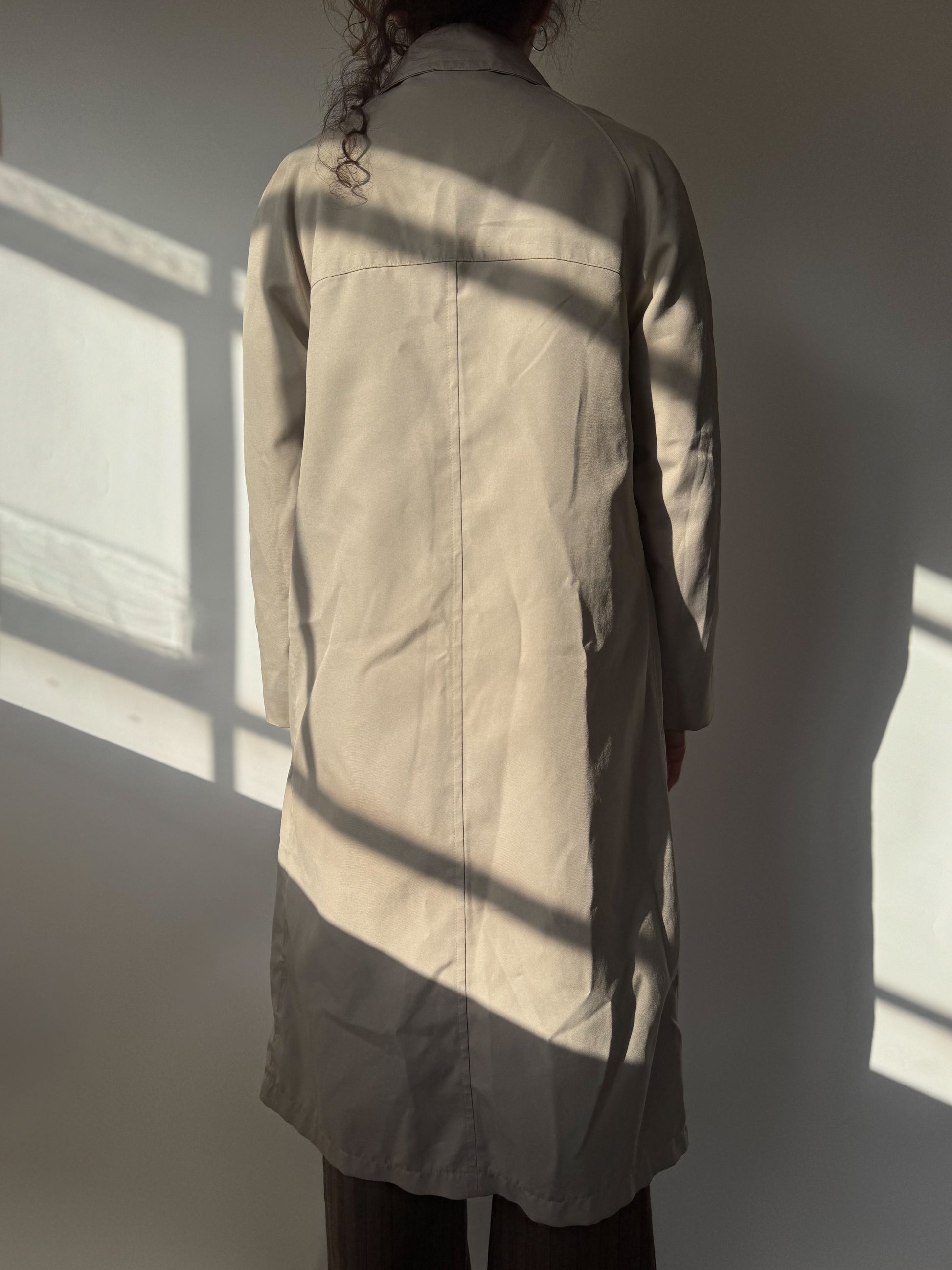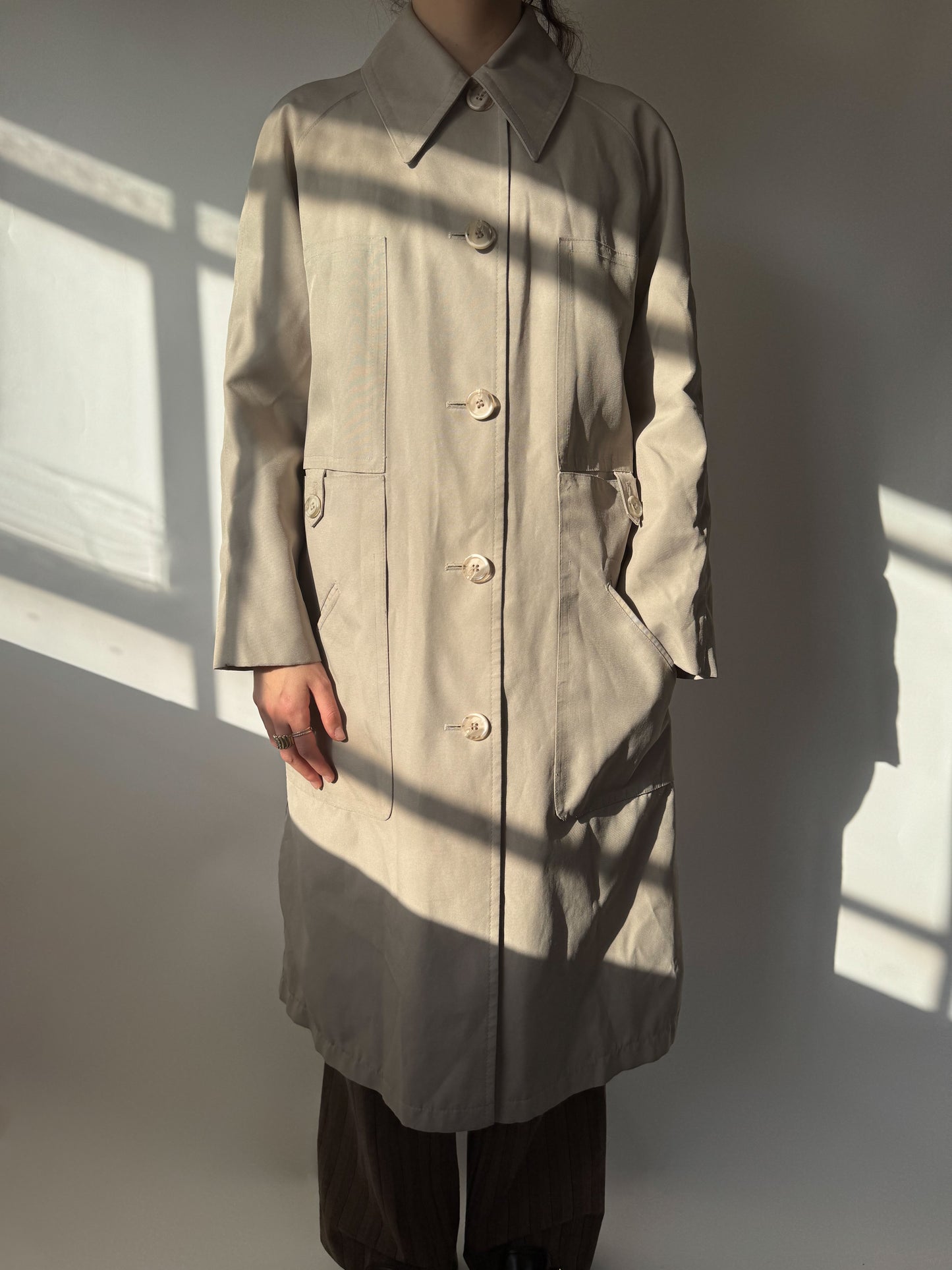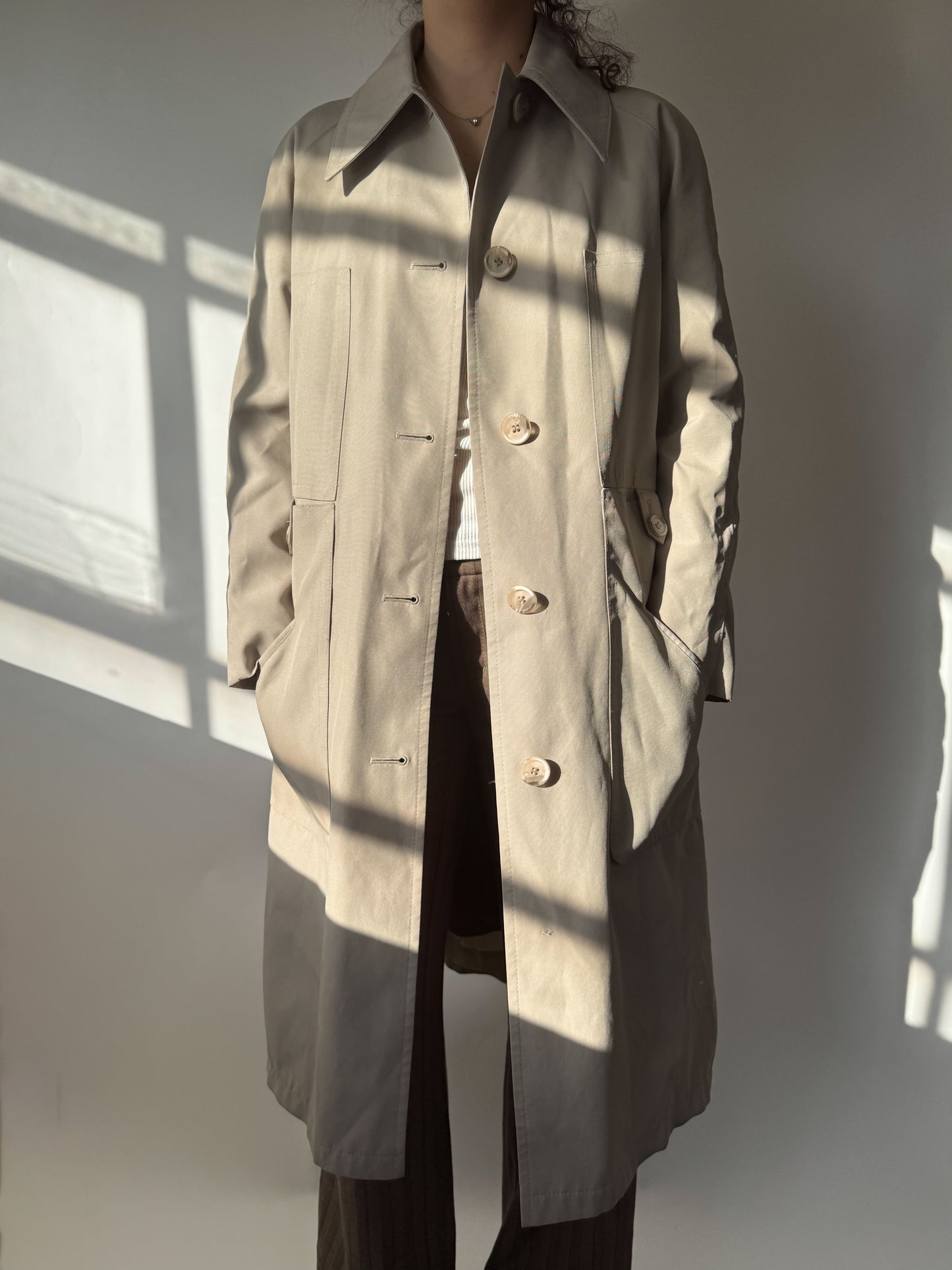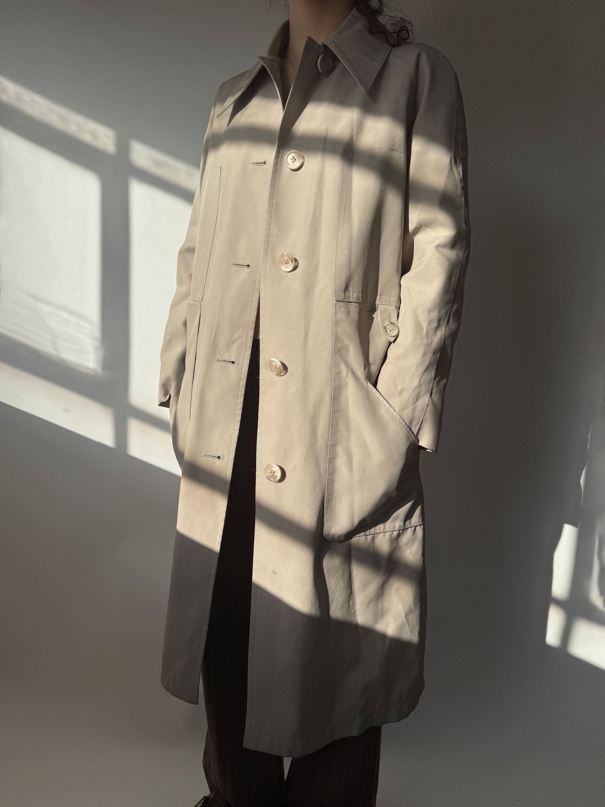 מעיל טרנץ׳ בצבע בז׳, גזרת A. ארבעה כיסים בחזית וסגירת כפתורים לכל האורך. בטנת צמר אדומה הניתנת להסרה.